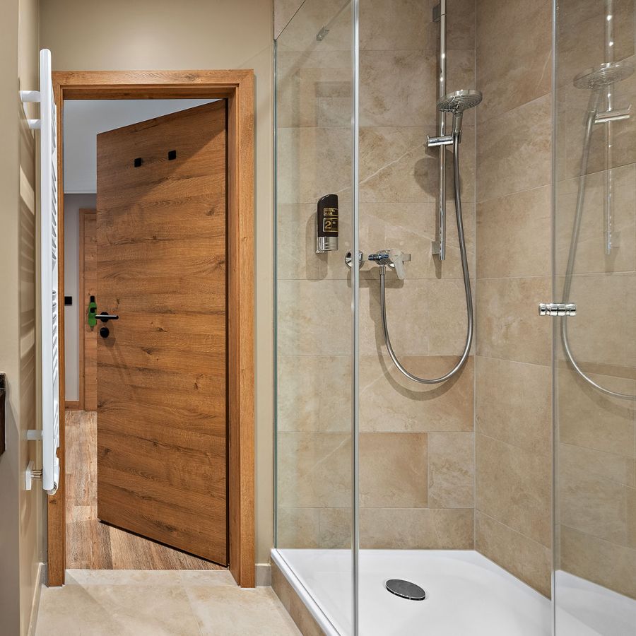 NEU seit Frühjahr 2026 – Sanfte Altrosa-Töne, warme Holzelemente und ein kuscheliges Boxspringbett schaffen im Doppelzimmer Komtess eine Wohlfühl-Atmosphäre. Minibar, Schreibtisch und das Bad mit Dusche versprechen ein Plus an Komfort für Ihre Wellnessauszeit.