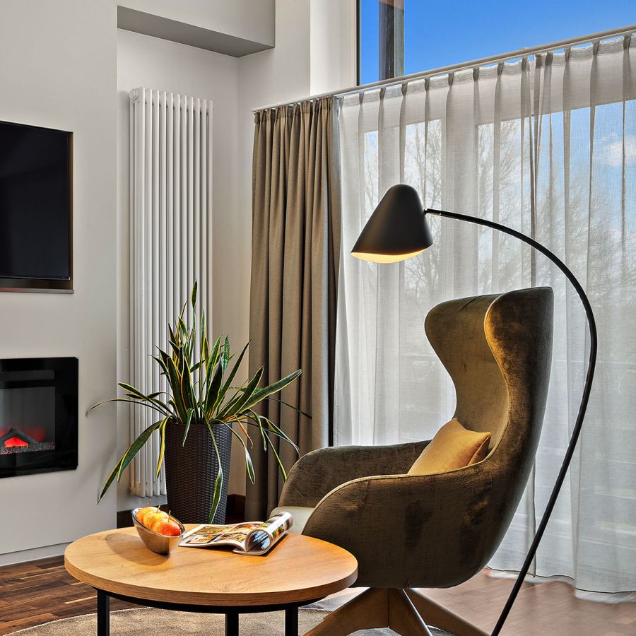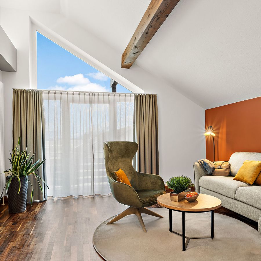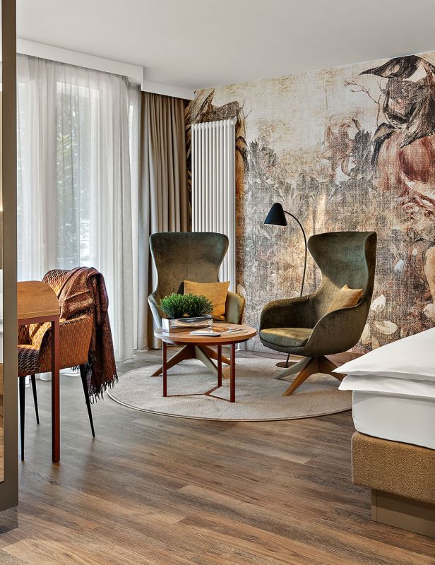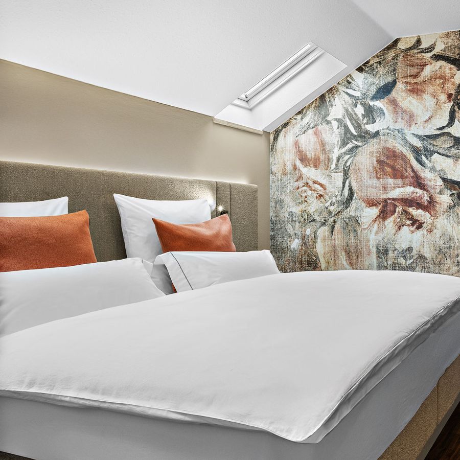 NEU seit Frühjahr 2026 – Im Dachgeschoss wartet unsere elegante Suite Churfürst Komfort auf Sie: 48 m² Raum zum Entspannen, ein getrennter Schlaf- und Wohnbereich mit Platz für 2-4 Personen, ein stimmungsvoller elektrischer Kamin, eine Nespresso-Maschine, ein Balkon mit Südausrichtung und vieles mehr.