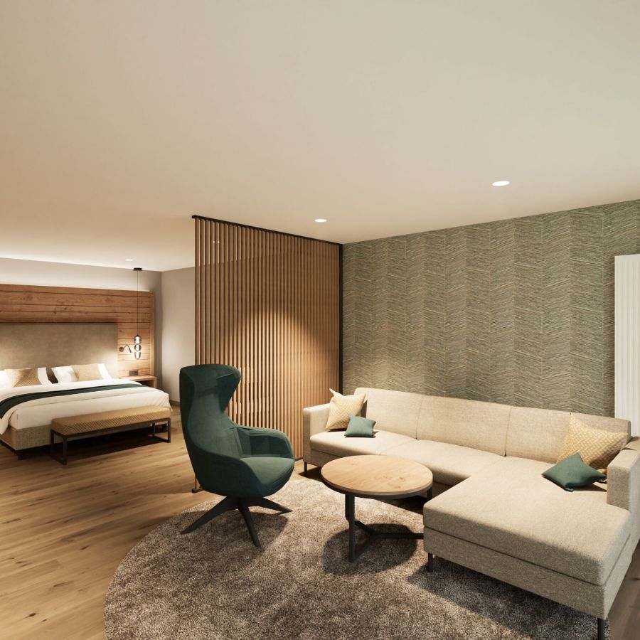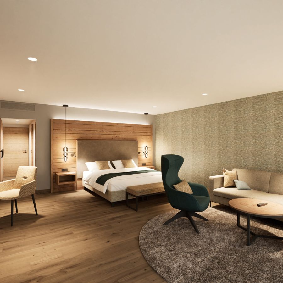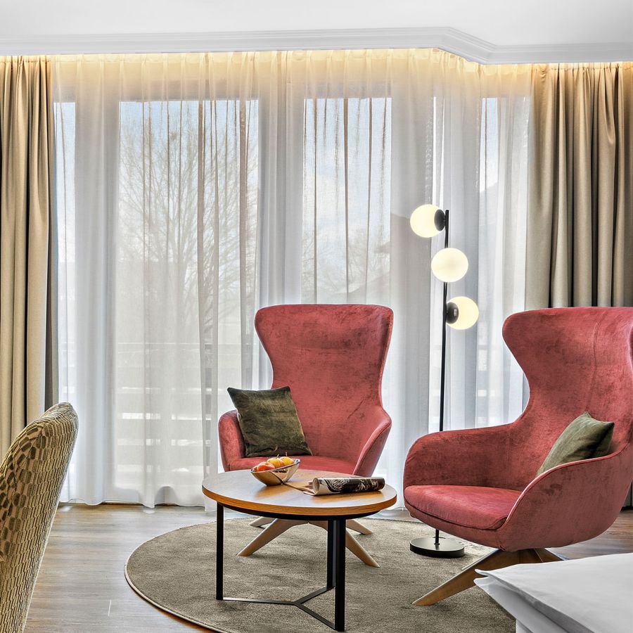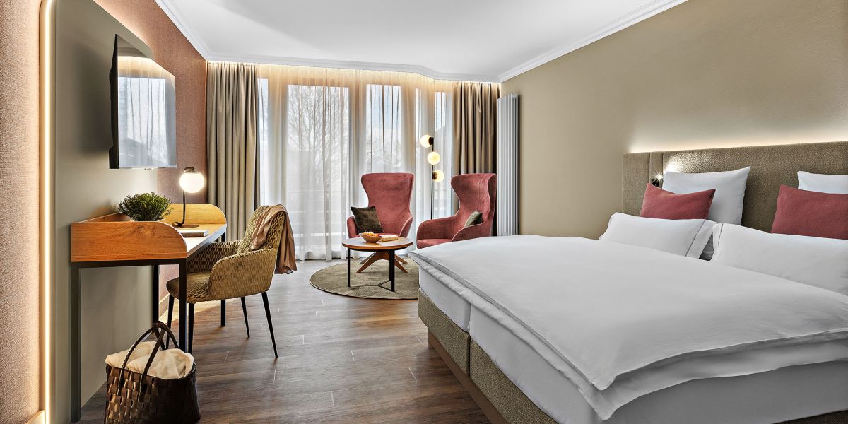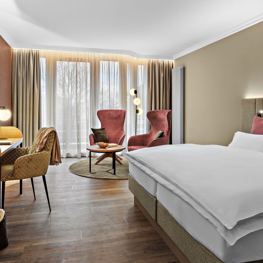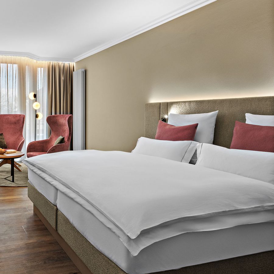 NEU ab Sommer 2026 – Unsere frisch renovierten Junior Suiten verbinden modernes Design mit großzügigem Raumgefühl. Freuen Sie sich auf eine stilvolle Unterkunft für erholsame Tage im Churfürstenhof Bad Birnbach.
