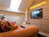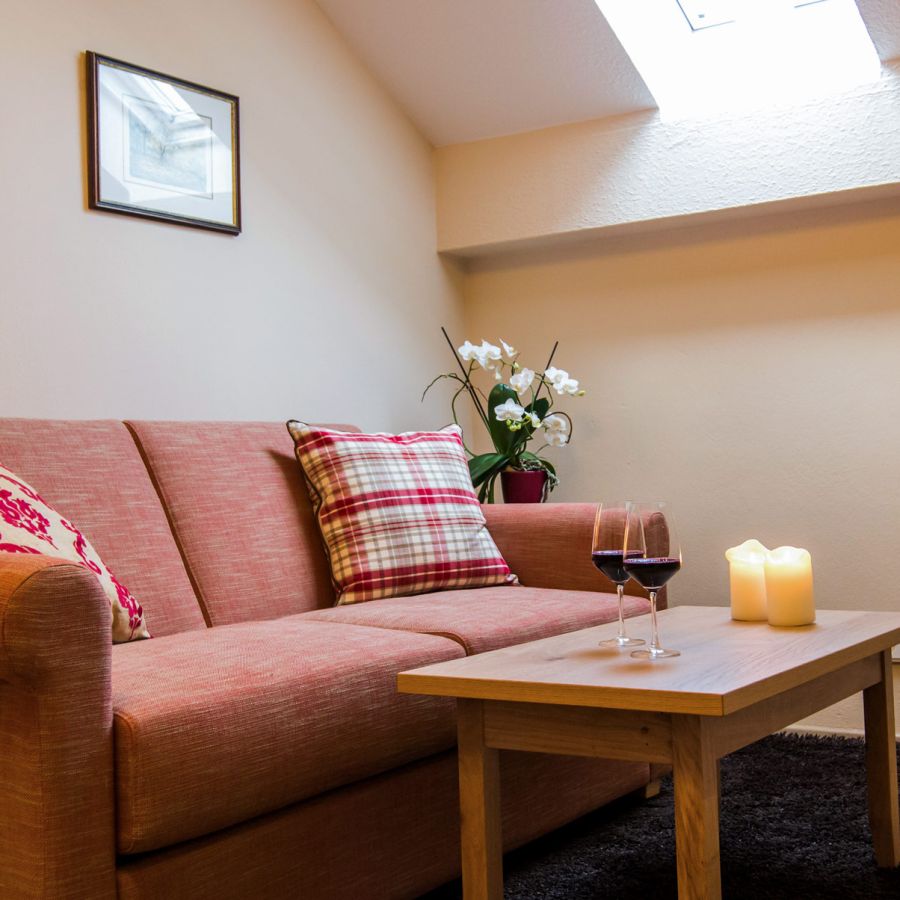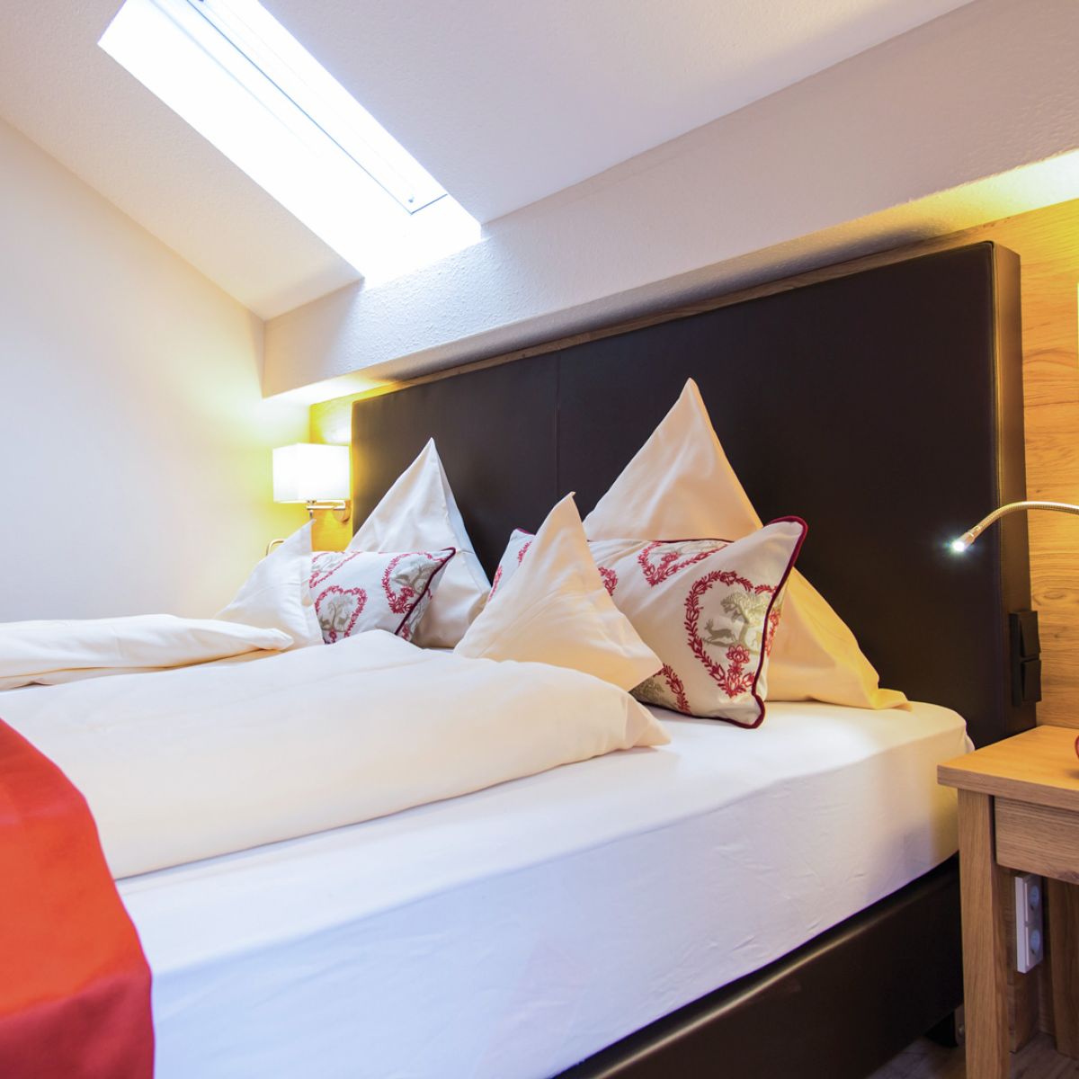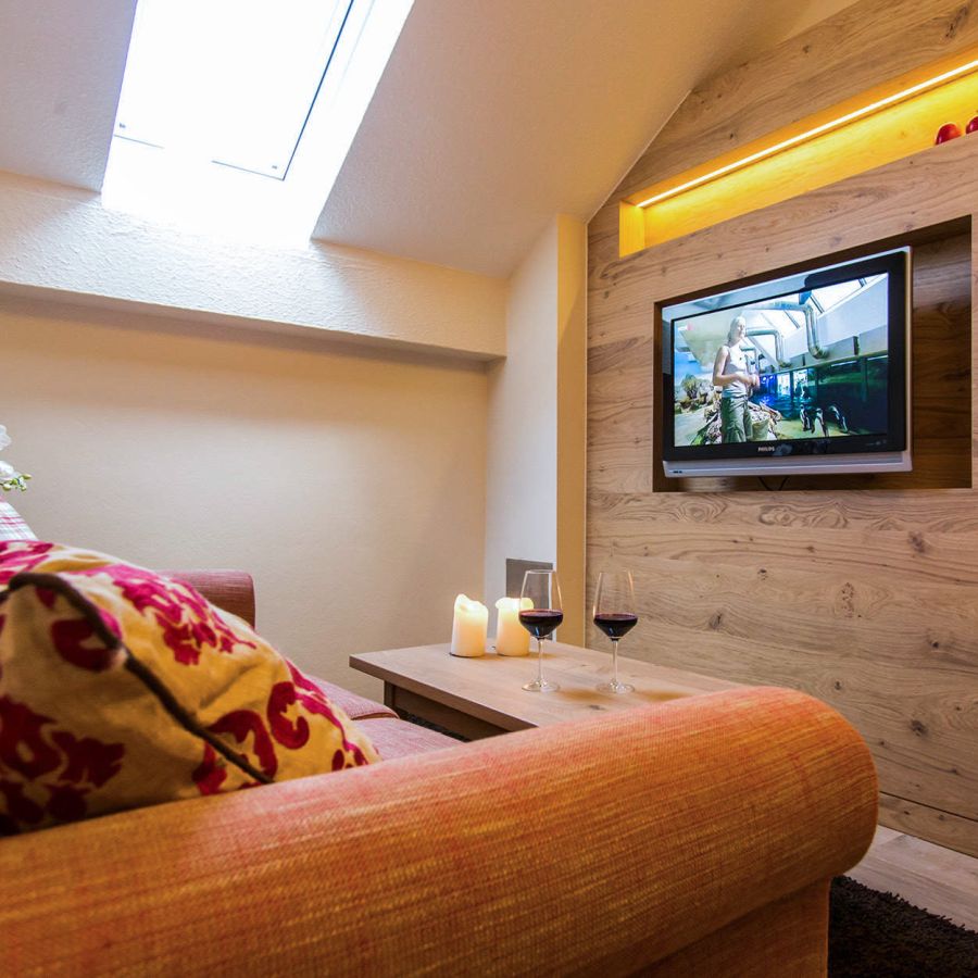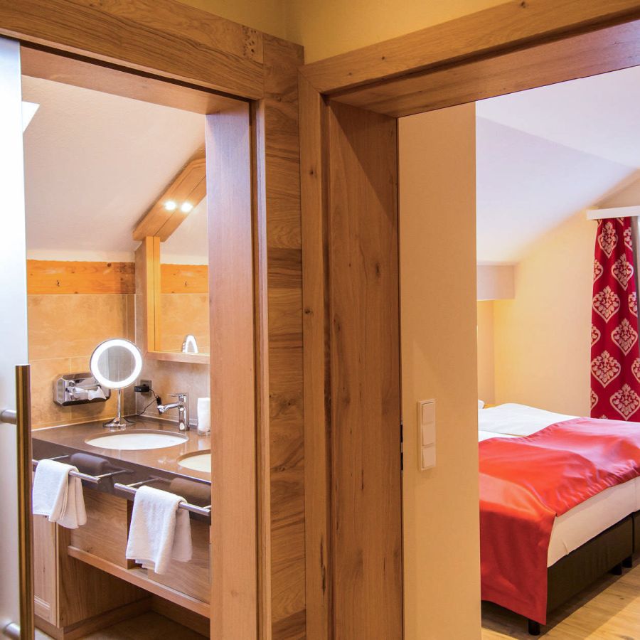 Einzigartig im Wellnesshotel Churfürstenhof: Das Bad Birnbach Chalet mit zwei getrennten Zimmern gibt es nur einmal. Morgensonne auf dem Ostbalkon, der Blick durch die Dachfenster in den blauen Himmel und natürliche Holz-Oberflächen sorgen für echtes Chalet-Feeling und strahlen Gemütlichkeit aus.