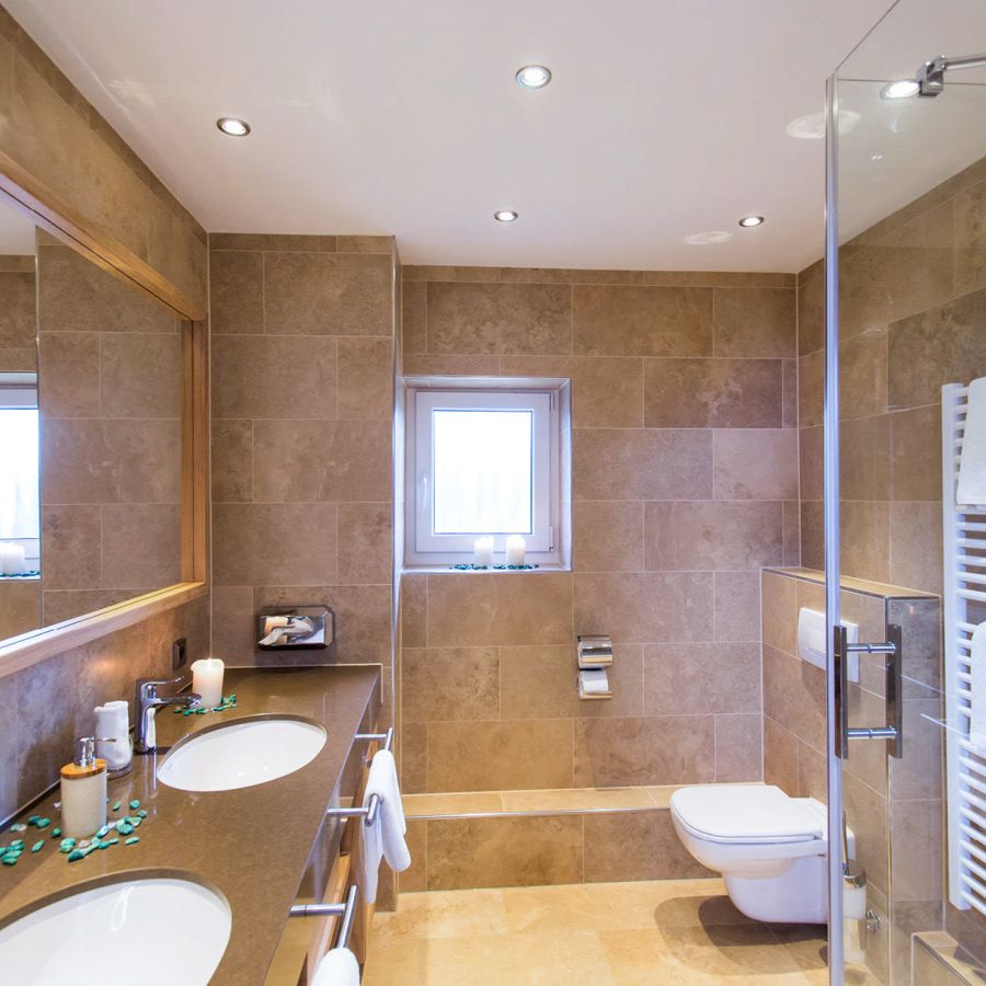 Großes Badezimmer mit Dusche, Doppelwaschbecken, WC & Föhn
