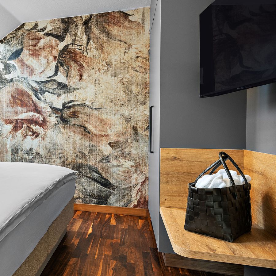 NEU seit Frühjahr 2026 – Florale Motive an der Wand und ein herrlicher Blick in die Natur: Das Doppelzimmer Prinzess besticht mit warmen Farbtönen, hochwertiger Ausstattung und ganz viel Gemütlichkeit. Ideal für einen Wellnessurlaub zu zweit.